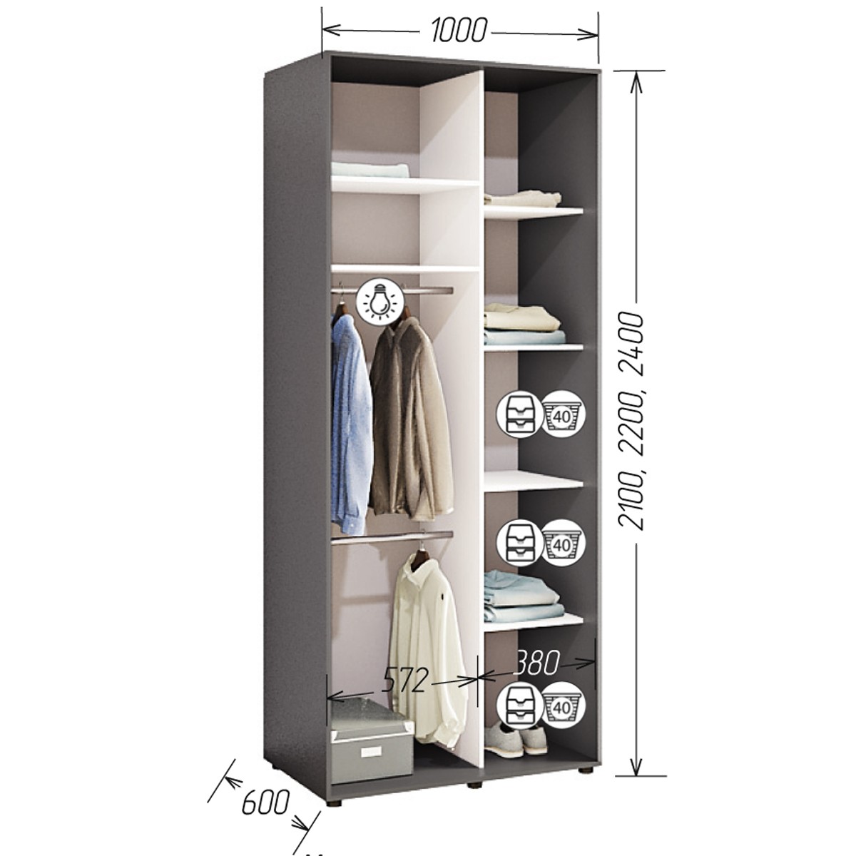 Шафа виготовлена з міцного ДСП, який пройшов всі сертифікації в Україні. По периметру шафи йде кромка ПВХ 2,0 мм, всередині 0,5мм. Крім стандартні розмірів, виробник дає можливість виготовлення шафи не стандартного розміру, крок 5 см.