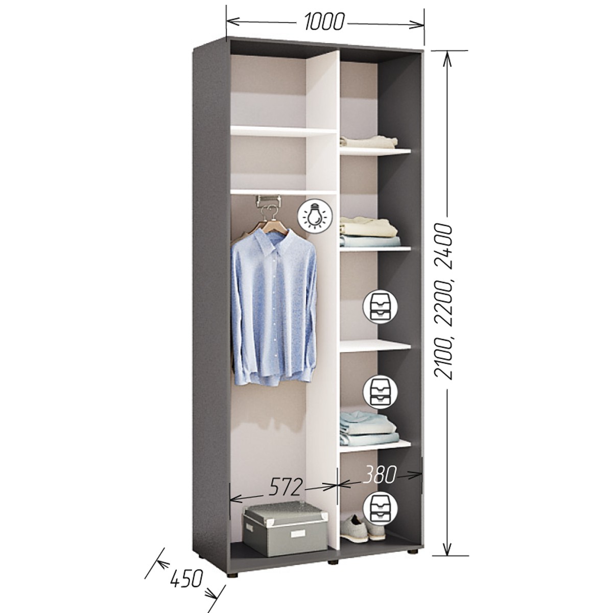 *Базова ціна включає в себе корпус з ДСП 16мм 1.0 * 2,1 * 0,45м, комплектацію дверей з алюмінієвого профілю Срібло, наповнення дверей: ДСП 16 мм.