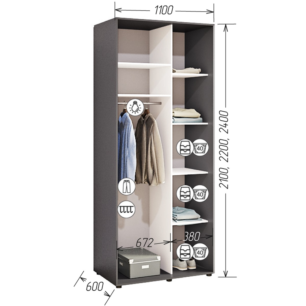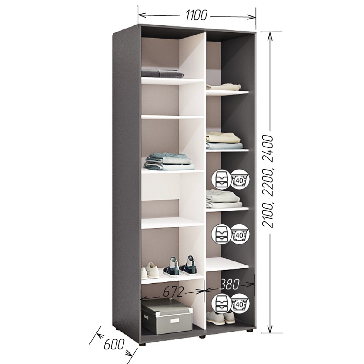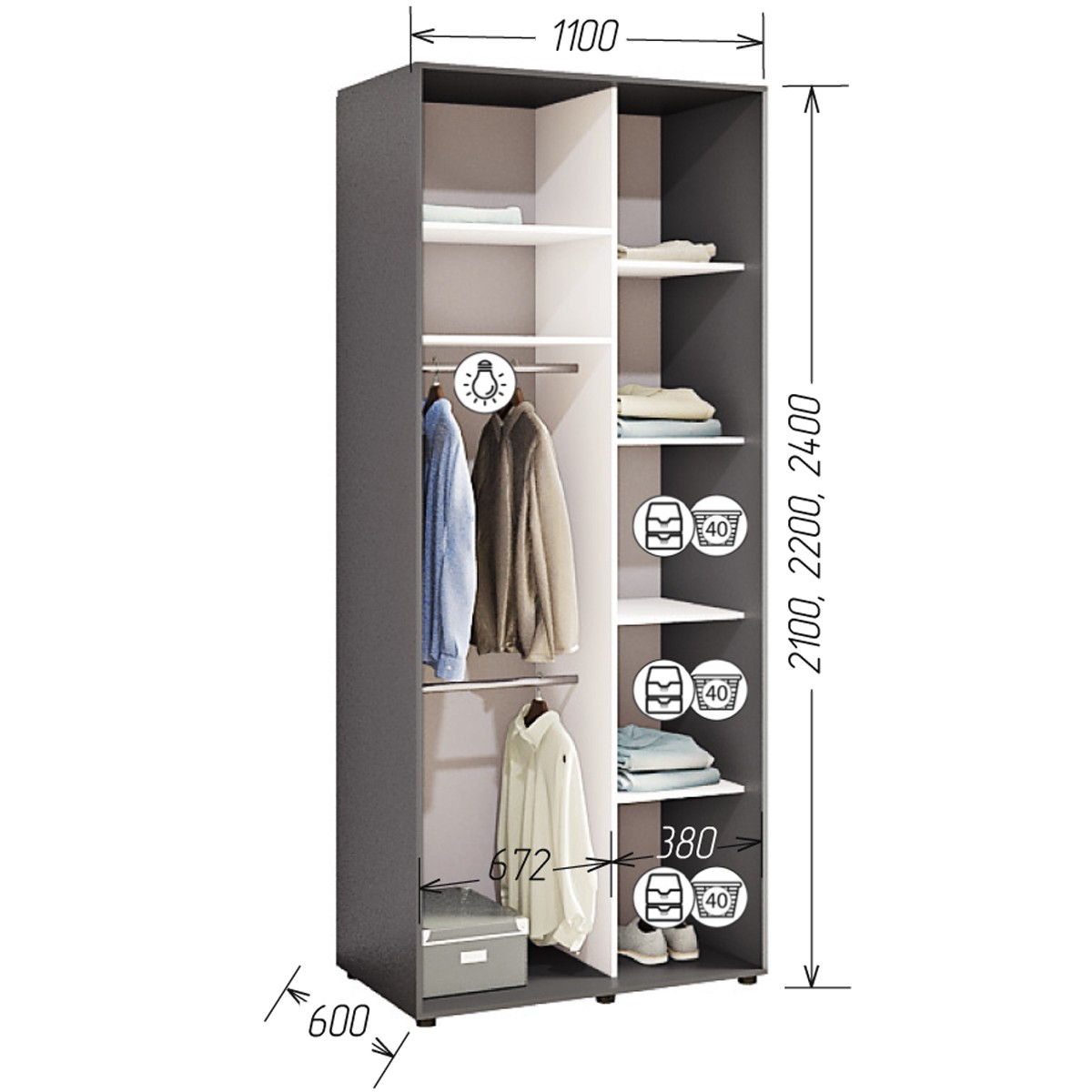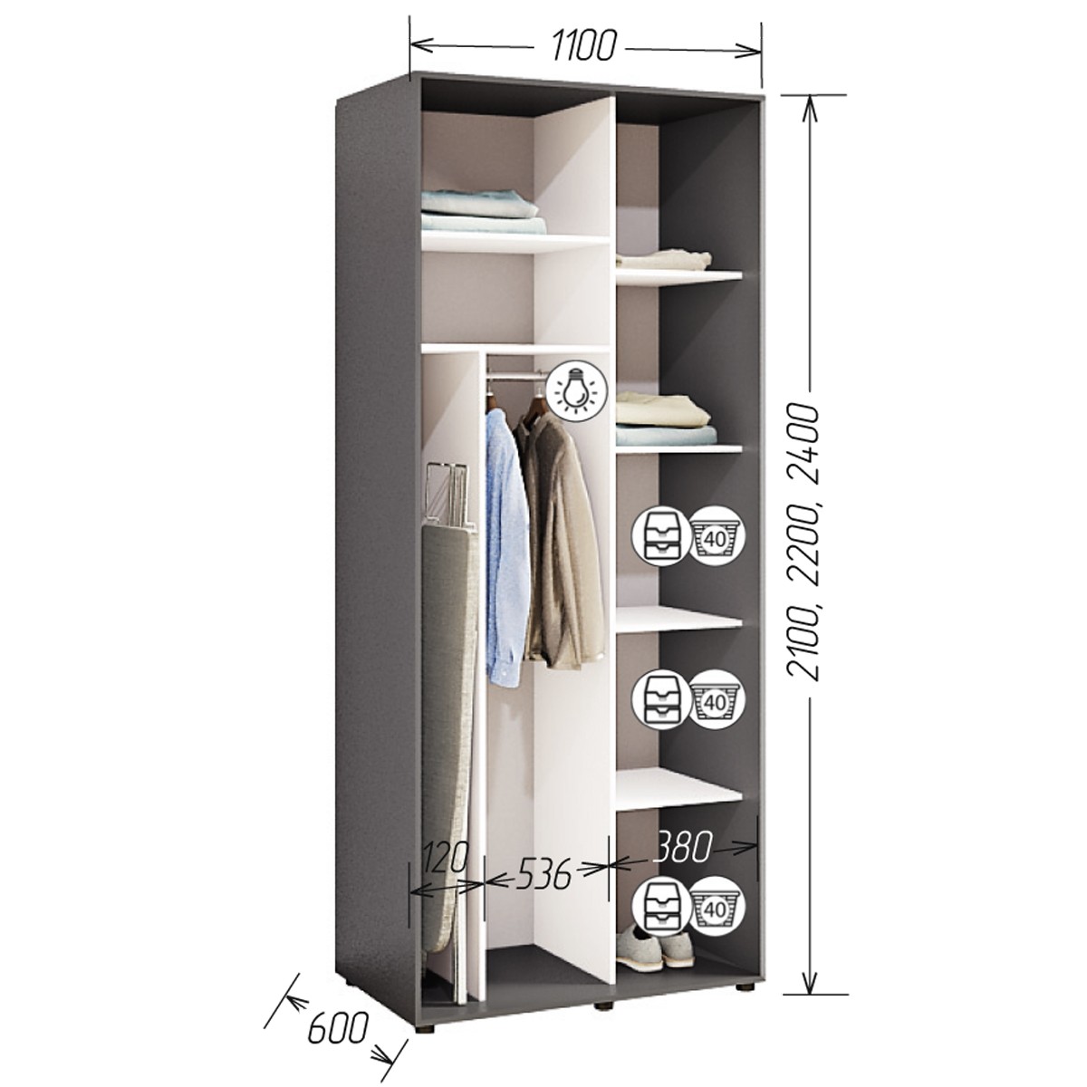 Шафа виготовлена з міцного ДСП, який пройшов всі сертифікації в Україні. По периметру шафи йде кромка ПВХ 2,0 мм, всередині 0,5мм. Крім стандартні розмірів, виробник дає можливість виготовлення шафи не стандартного розміру, крок 5 см.