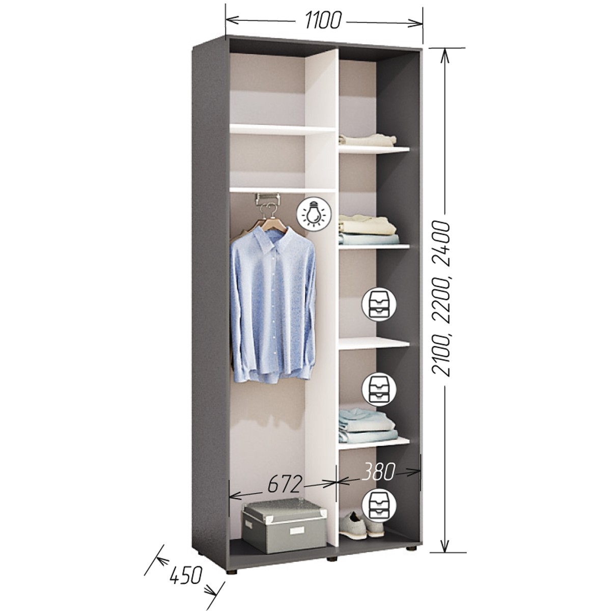 *Базова ціна включає в себе корпус з ДСП 16мм 1.1 * 2,1 * 0,45м, комплектацію дверей з алюмінієвого профілю Срібло, наповнення дверей: ДСП 16 мм.